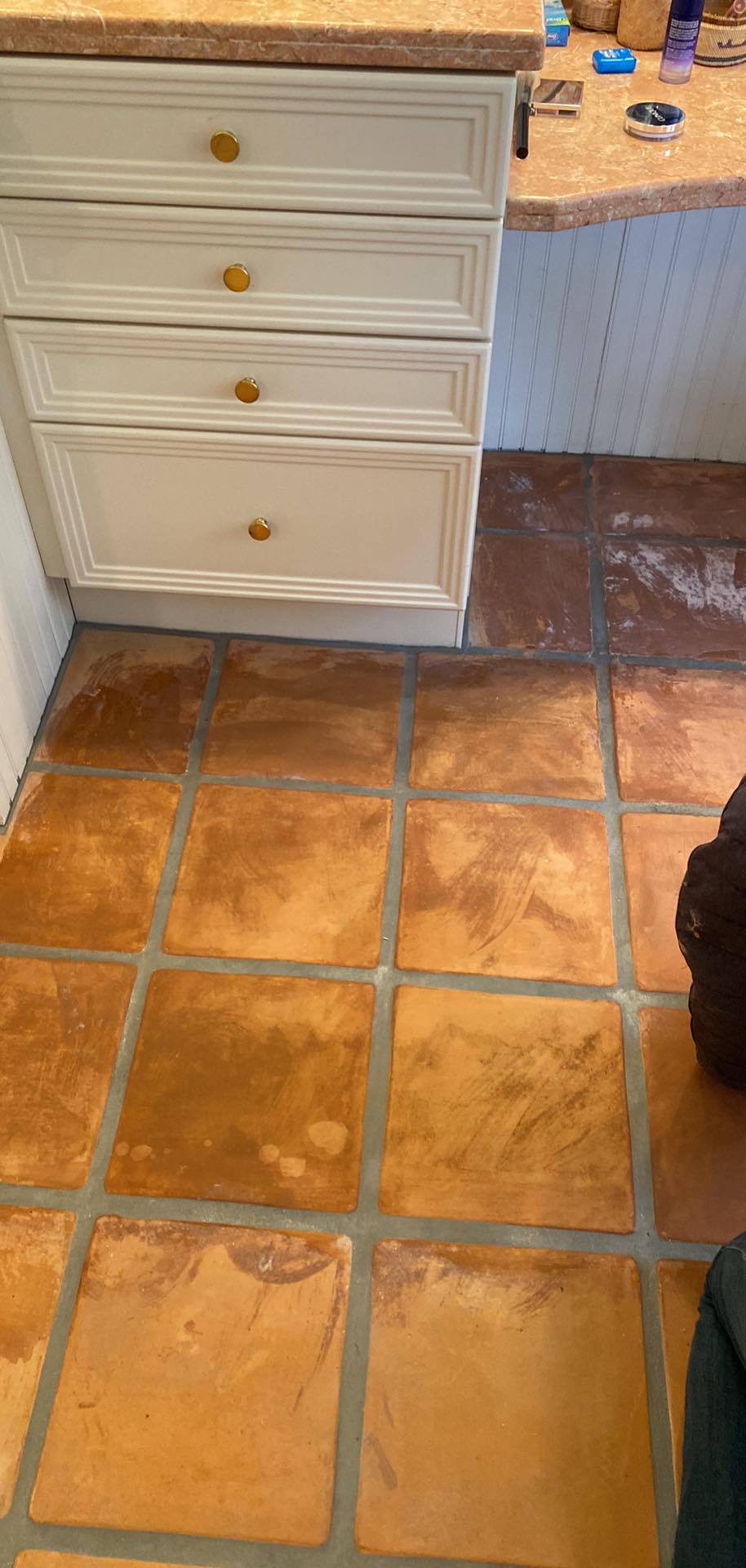 Im not sure how to discribe this situation of a carpet cleaner who (must?) be suffering from a lack of work, who thought it would be a good idea to strip a Saltillo floor for an elderly lady who called to complain that she was slipping when coming out of her shower.