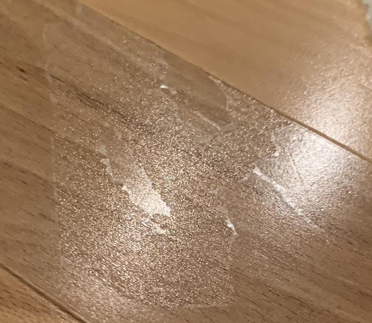 I'd say the Prespray migrated under the tape and ate the finish on the bubbled spot and possibly the other spot too. The finish was probably already wore out allowing the Prespray into the wood. Could have got under the finish from the edge also from getting the carpet too wet.