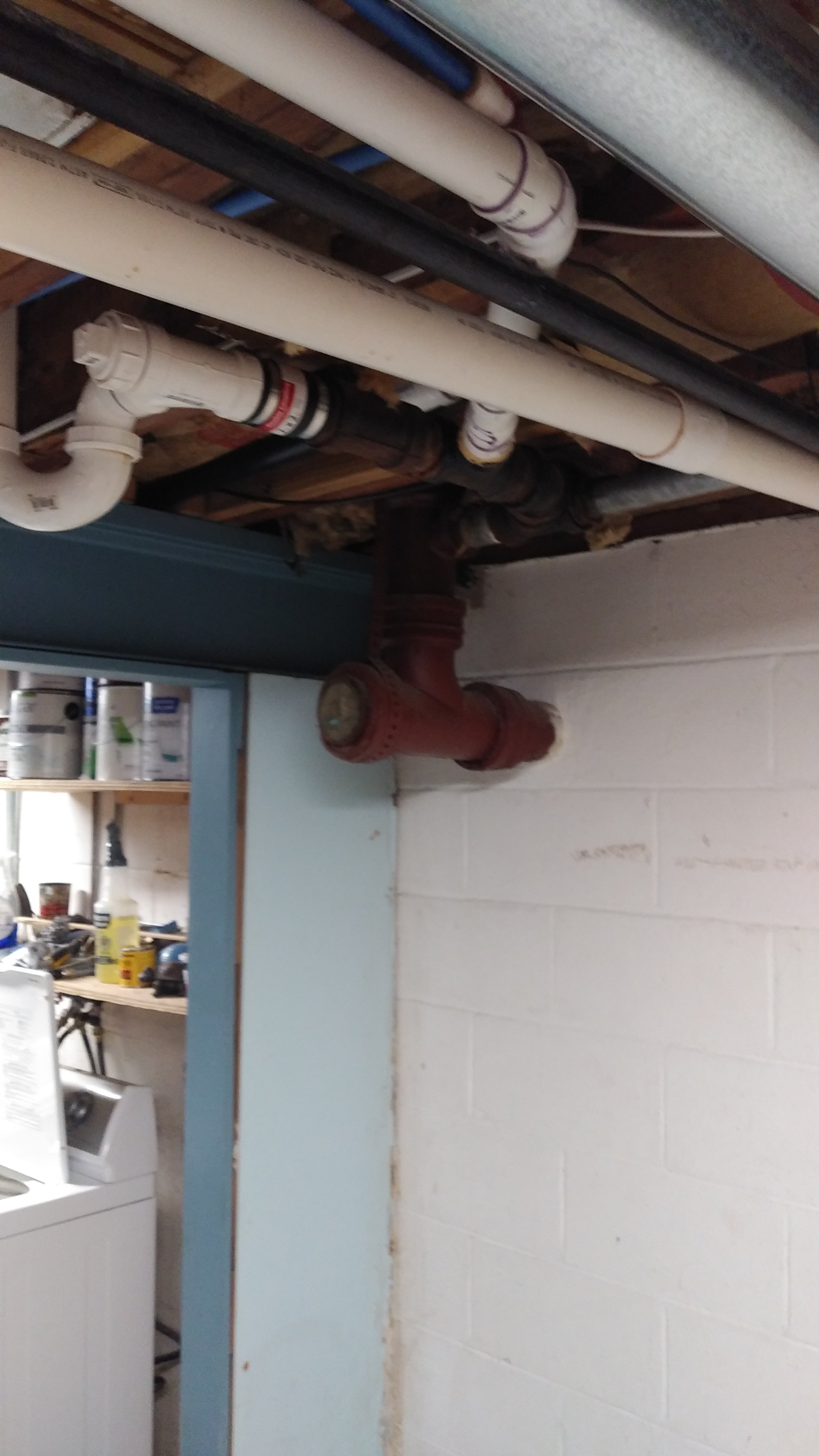 (4" cast pipe on left that goes from floor joists to into concrete)