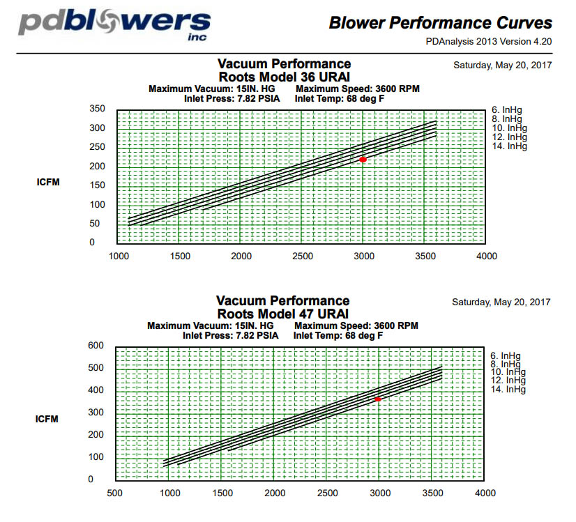 Here are the performance graphs of a 36 and 47 standard sutorbilt urai blower. Chosen because they share the same max rpm. Both are easily capable of 14"hg/190in of water. The difference is how much air is being moved at that lift level throughout the curve.