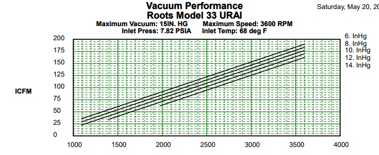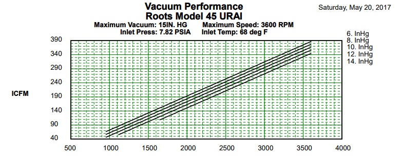 We know that most pros expect at least "45 blower performance" when cleaning carpet. Using the old school roots 45 urai curves I posted earlier we can see that at 80% of max rpm and 14" of lift around 12.5 HP are required to get the minimum performance a pro expects.