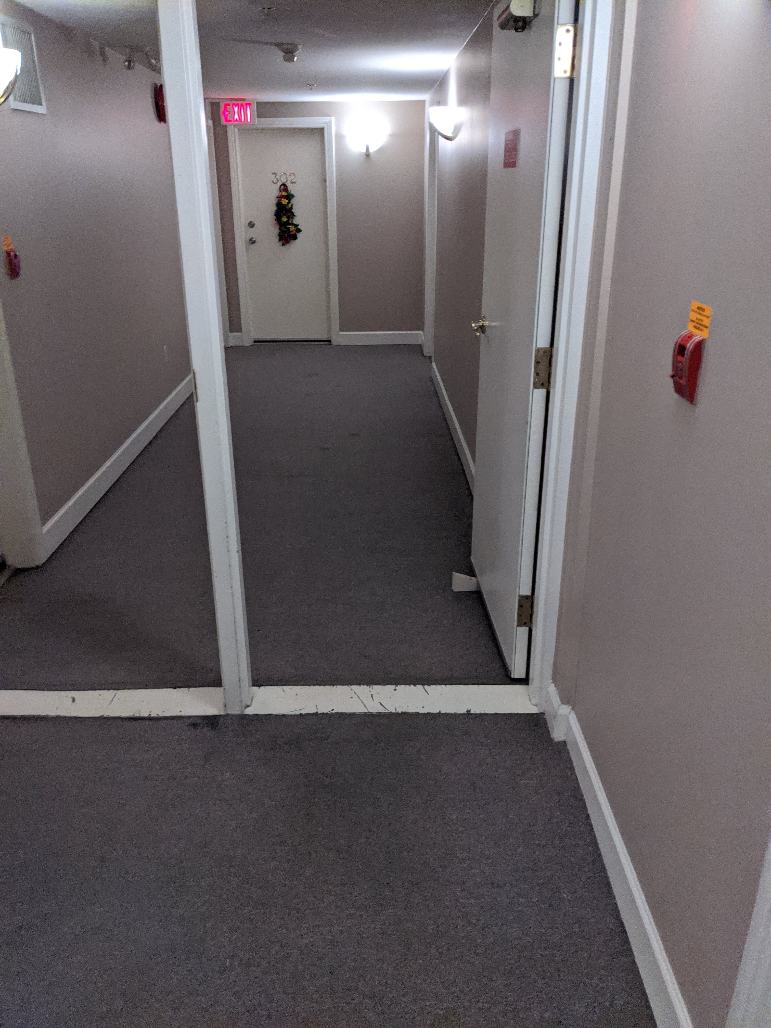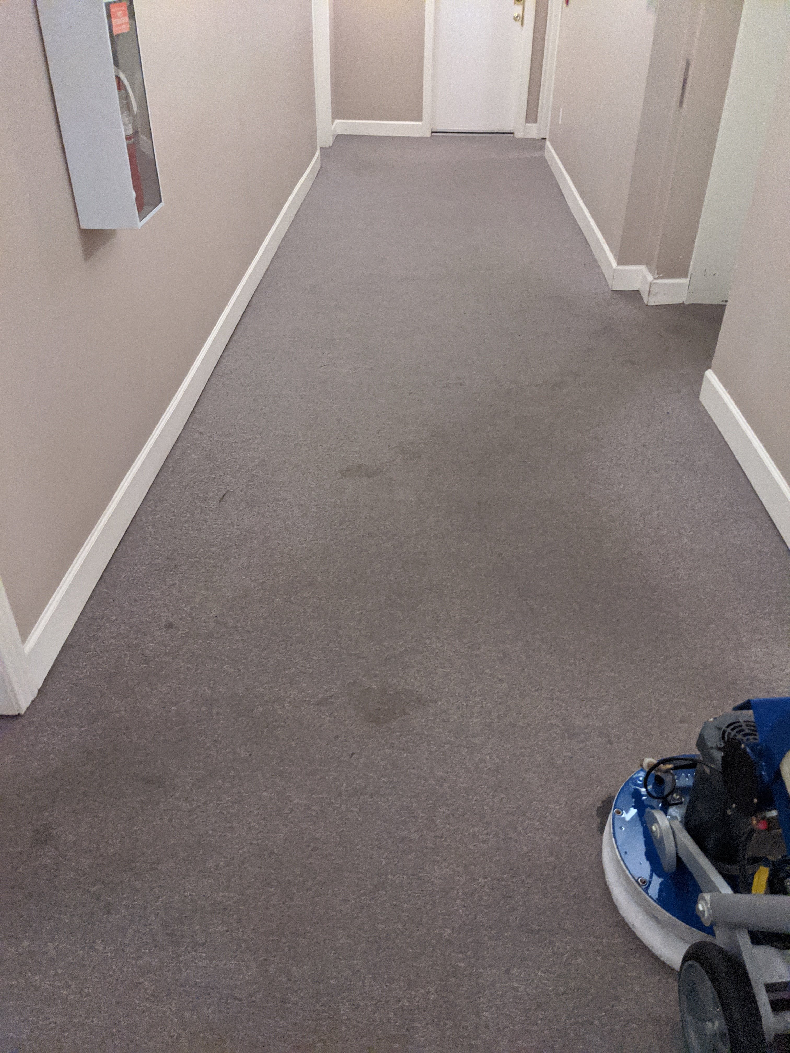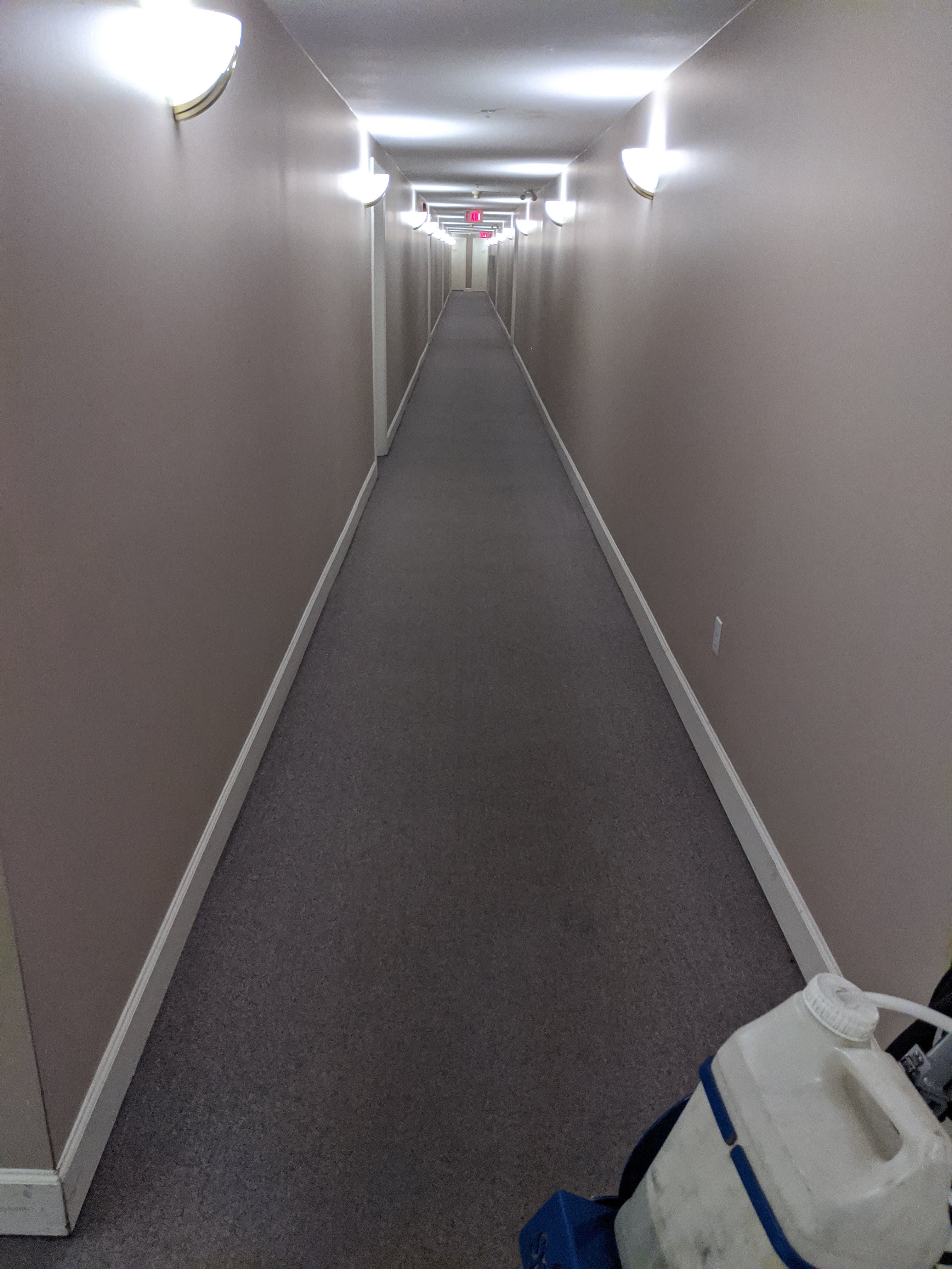 Here is a pic of one of the 4 hallways I did today. At each of the hallway is a stairwell. Aprox 180 stairs and landings. Used the sprayborg for the hallways and the Oreck for the stairs. It was absurdly easy to clean the stairs with the Oreck. Spray a section, plug in the machine then slowly let the machine fall over the bullnose. Sweep back and forth a couple of times and it's done. Best tool ever for bullnose. This job normally takes 7-8 hours with 2 men using the truck mount. I finished in 5 today by myself. The strata president was watching for a good part and was thrilled by how clean the carpets came. She was happy she didn't have to sit by an open door all day too.