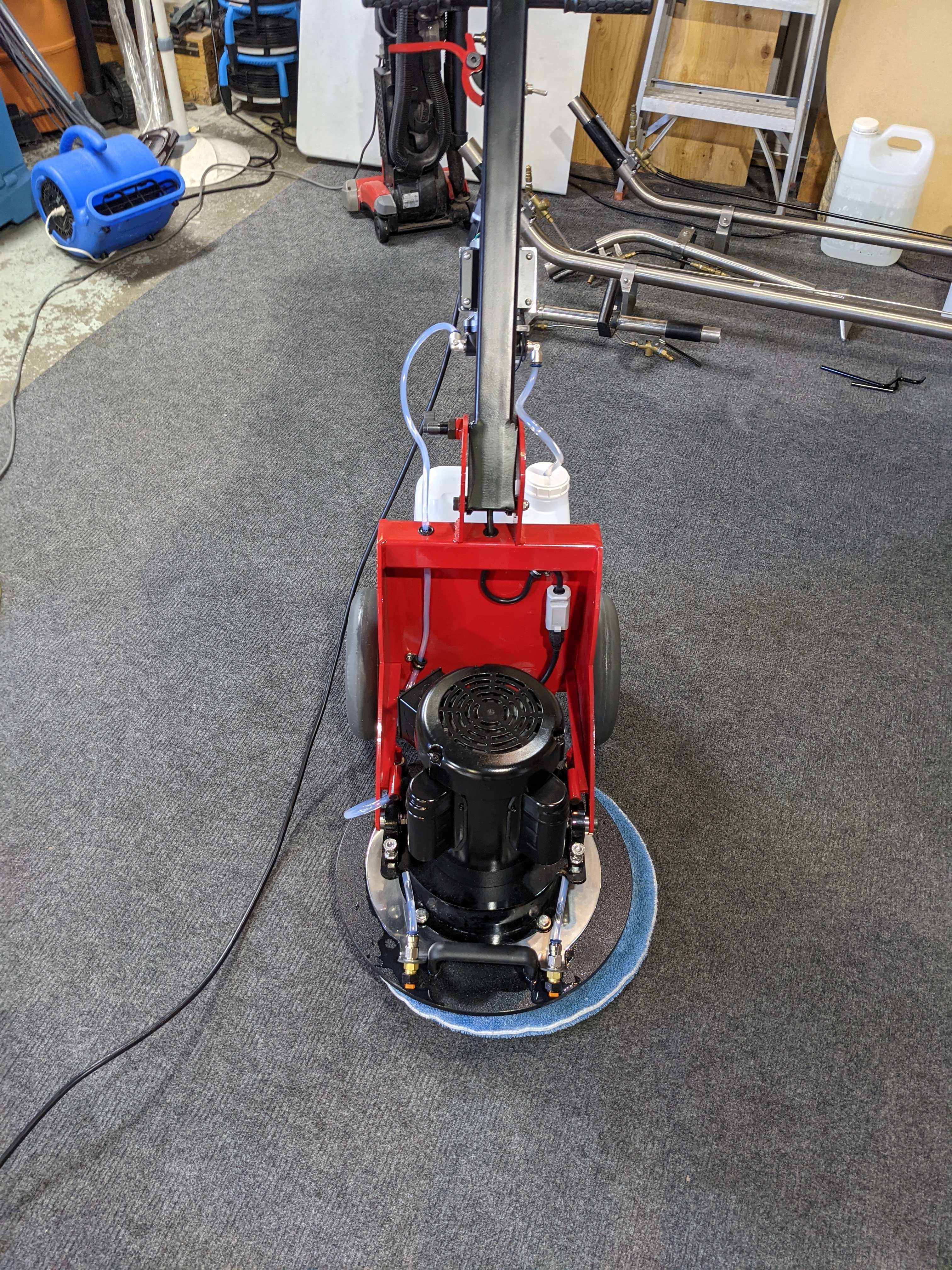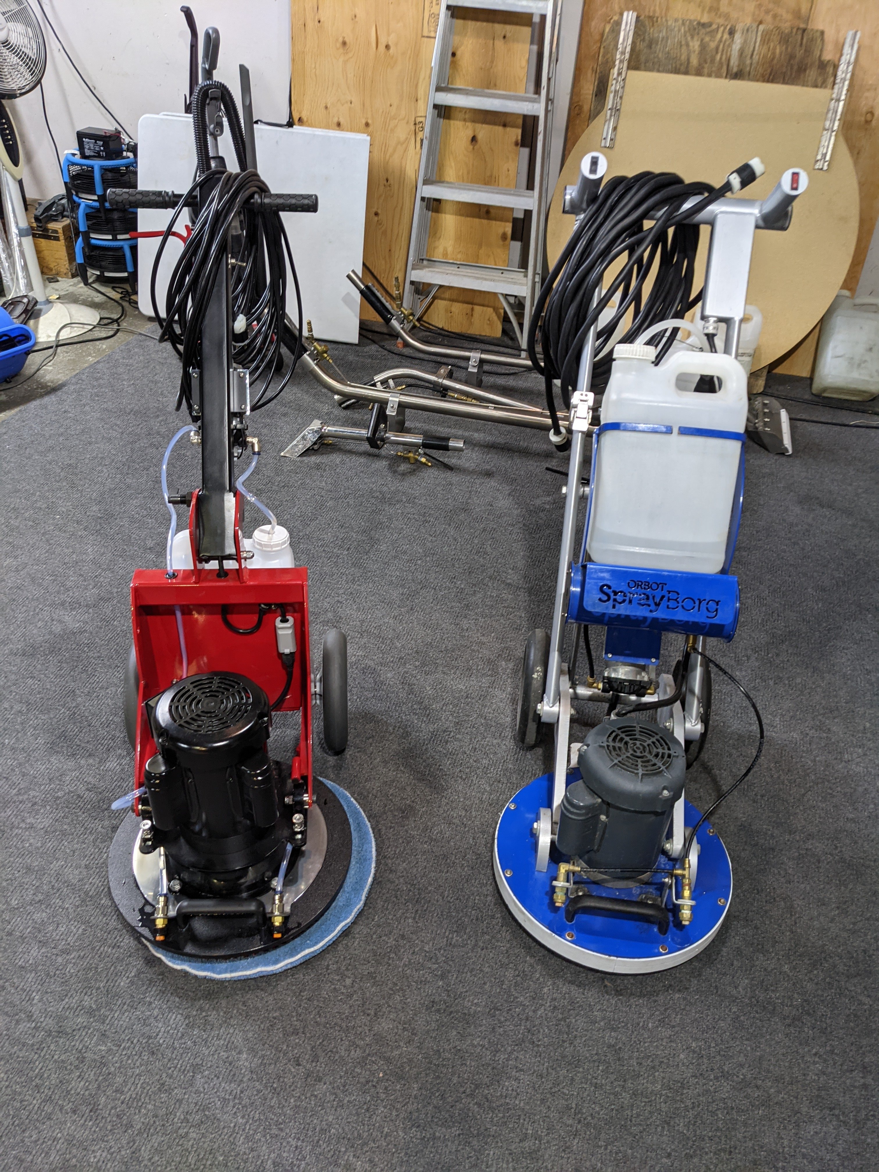 My beautiful red Phoenix arrived today. A warning for anyone ordering, it comes in a large box on a pallet. Luckily, it fits into my Cleanco no problem. Set it up, ground my driver on some concrete, put some water in the jug and presto, it's ready to go. Combined with my Sprayborg, I will be looking to clean more commercial carpet this year. Already have over $4000 scheduled for March. Just testing in the shop, the Phoenix spins much faster than the Sprayborg. Very easy to handle. Both machines use the same jugs and pads. Ready to clean some cgd.