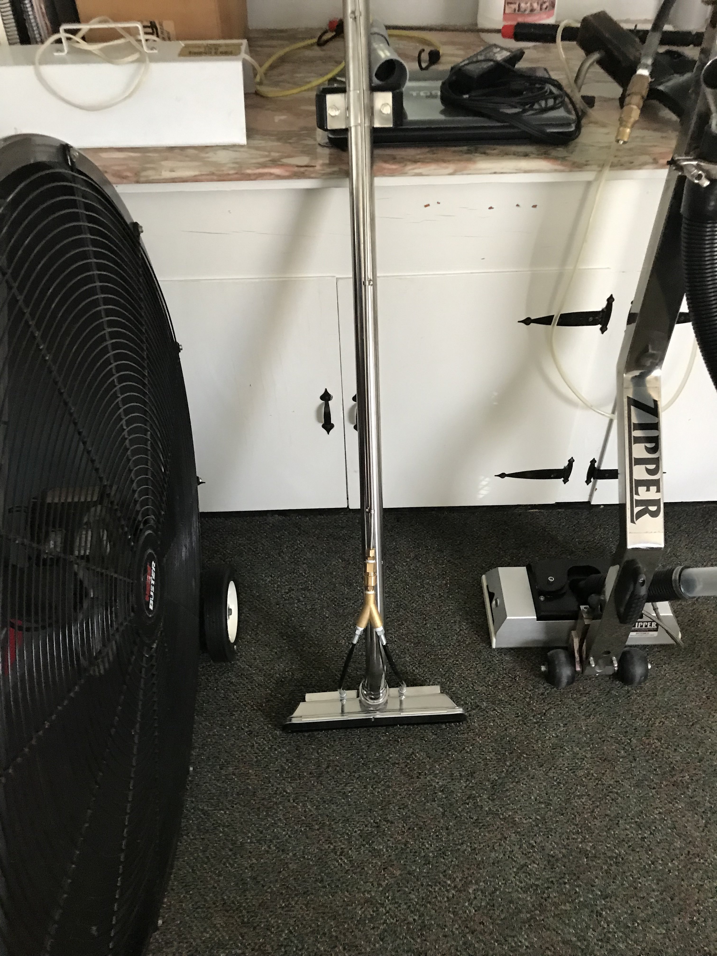 I thought that with a Butler Large blower and a short hose run, this brush wand, should not have a problem picking up the moisture from a tile floor.