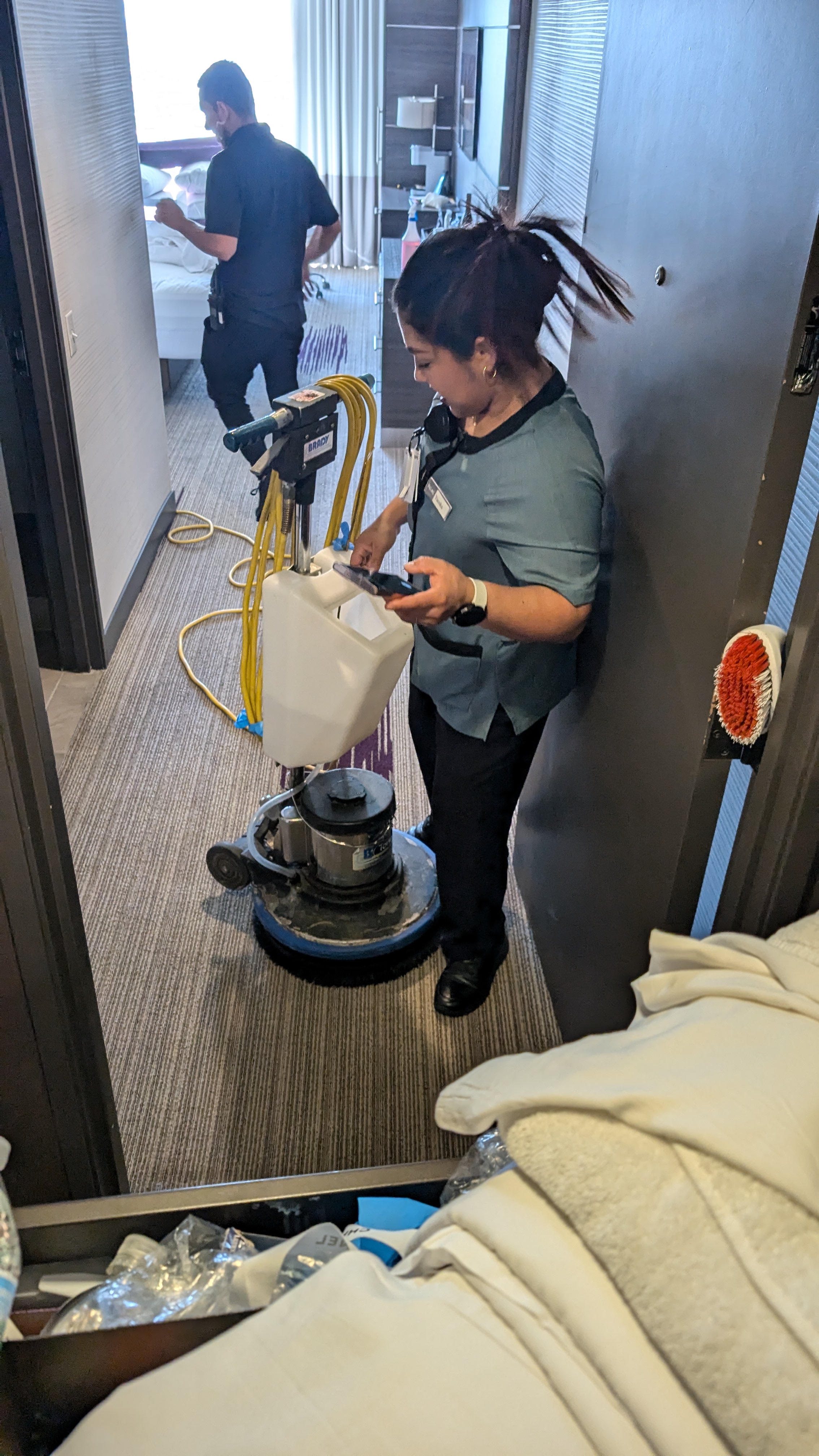 I see she is holding the favorite piece of technology that every employee of a carpet cleaner uses constantly......