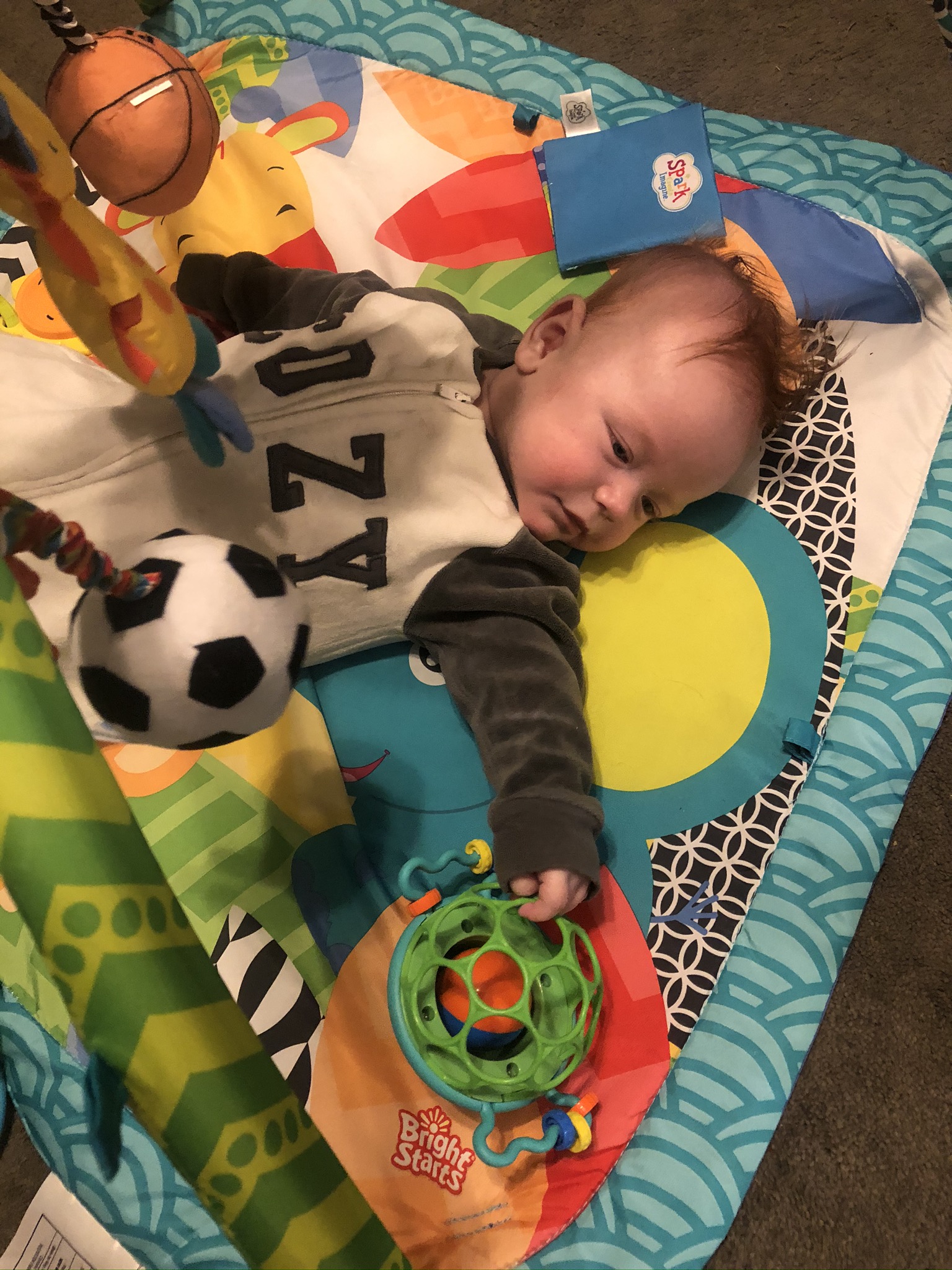 That would be something at 3 1/2 months. He did intentionally grab a toy and shake it today for the first time