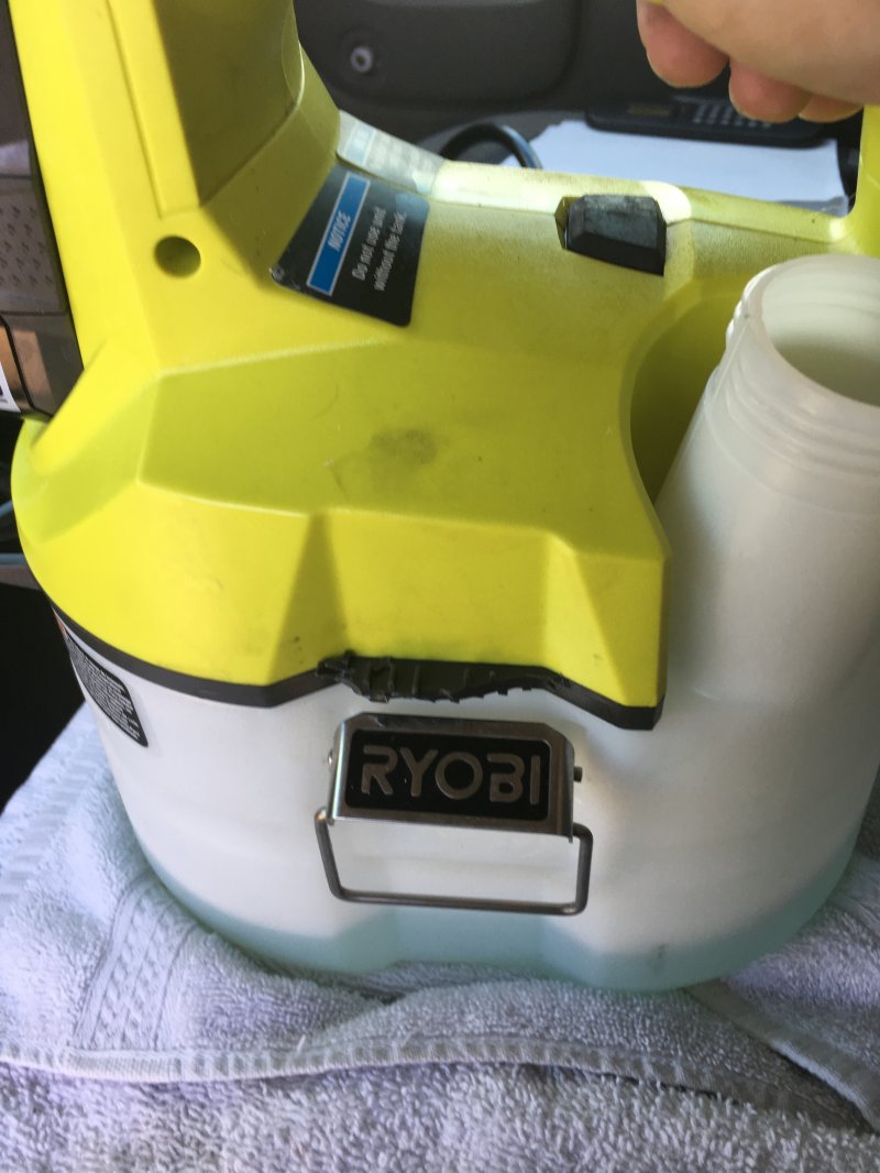 I give up. I don't even know why I get out of bed some days. The other day while talking with Mike on the phone I broke my little lid/cup for my Ryobi sprayer. Then today I broke off the clippy snapper thingy that holds the tank on. The tank fell off and spilled nicotine odorcide all over my chest and shorts. @encapman , are you sure you don't want me to test your new sprayer?