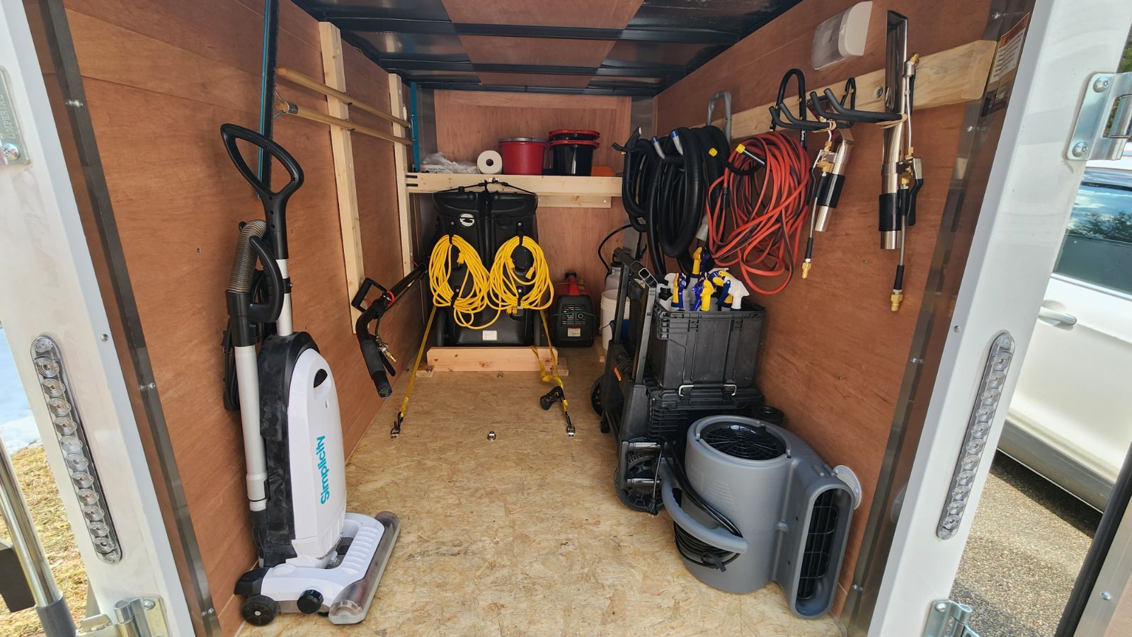 I already owned the 5' x 8' enclosed trailer and the Honda 2200 watt generator in the front. The rest of it I put together for under $3000 being thrifty. I admit I got an insanely good deal on the lightly used Hydramaster PEX 500 with the EVO wand for $1000. Since I took this pic I've added 1 more air mover. Next addition will be another sweet deal, a Green Glides hard surface wand at retail price plus shipping.