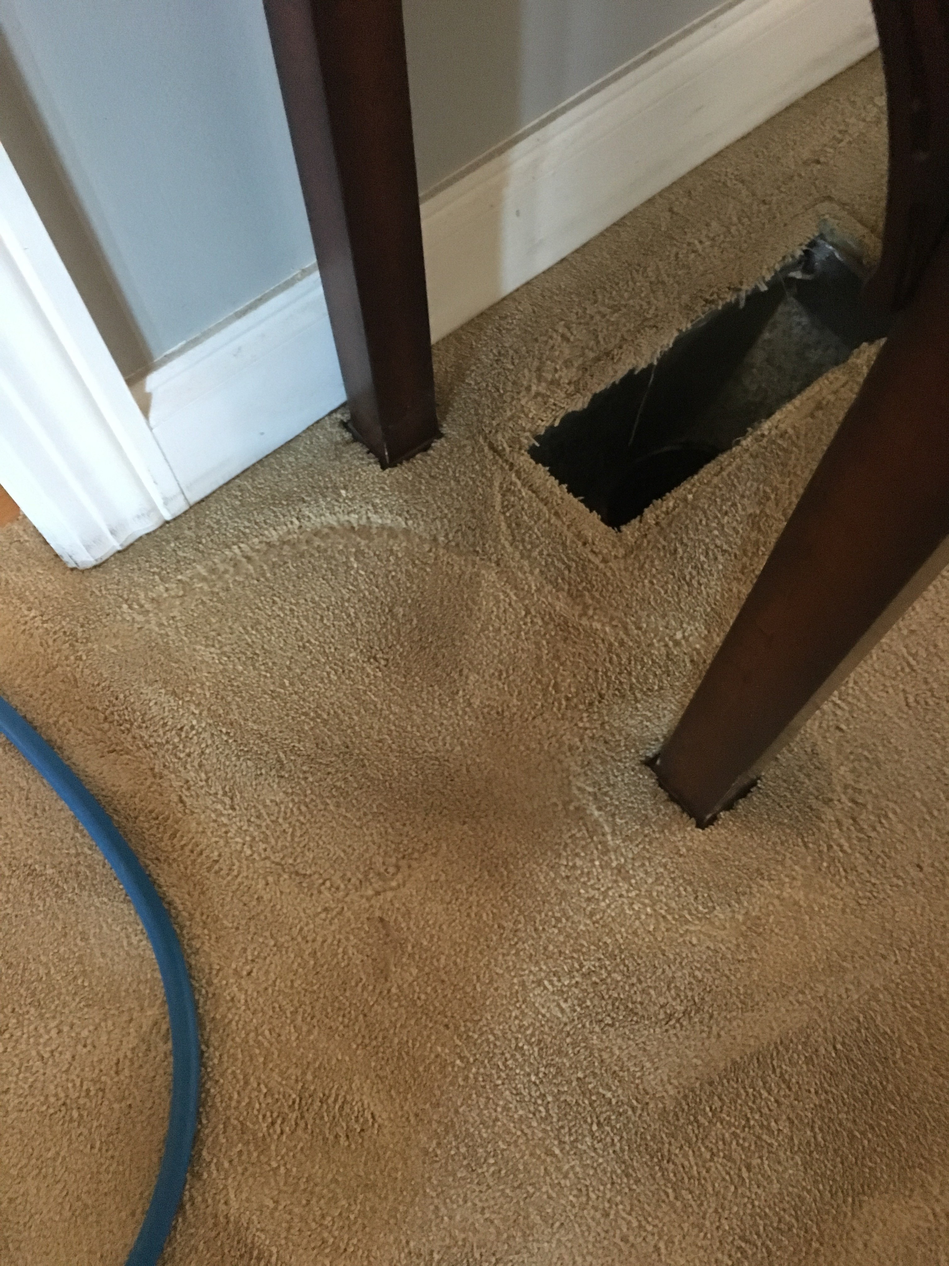 This is five year old carpet. The owner has several Roombas programmed to snuffle around at night, but they have hung up in the legs of this side table. Ignore the wand marks, look at the damage patterns. Two are from getting jammed between the end legs, one is from circling the front leg endlessly and the other is from getting caught on the air vent.