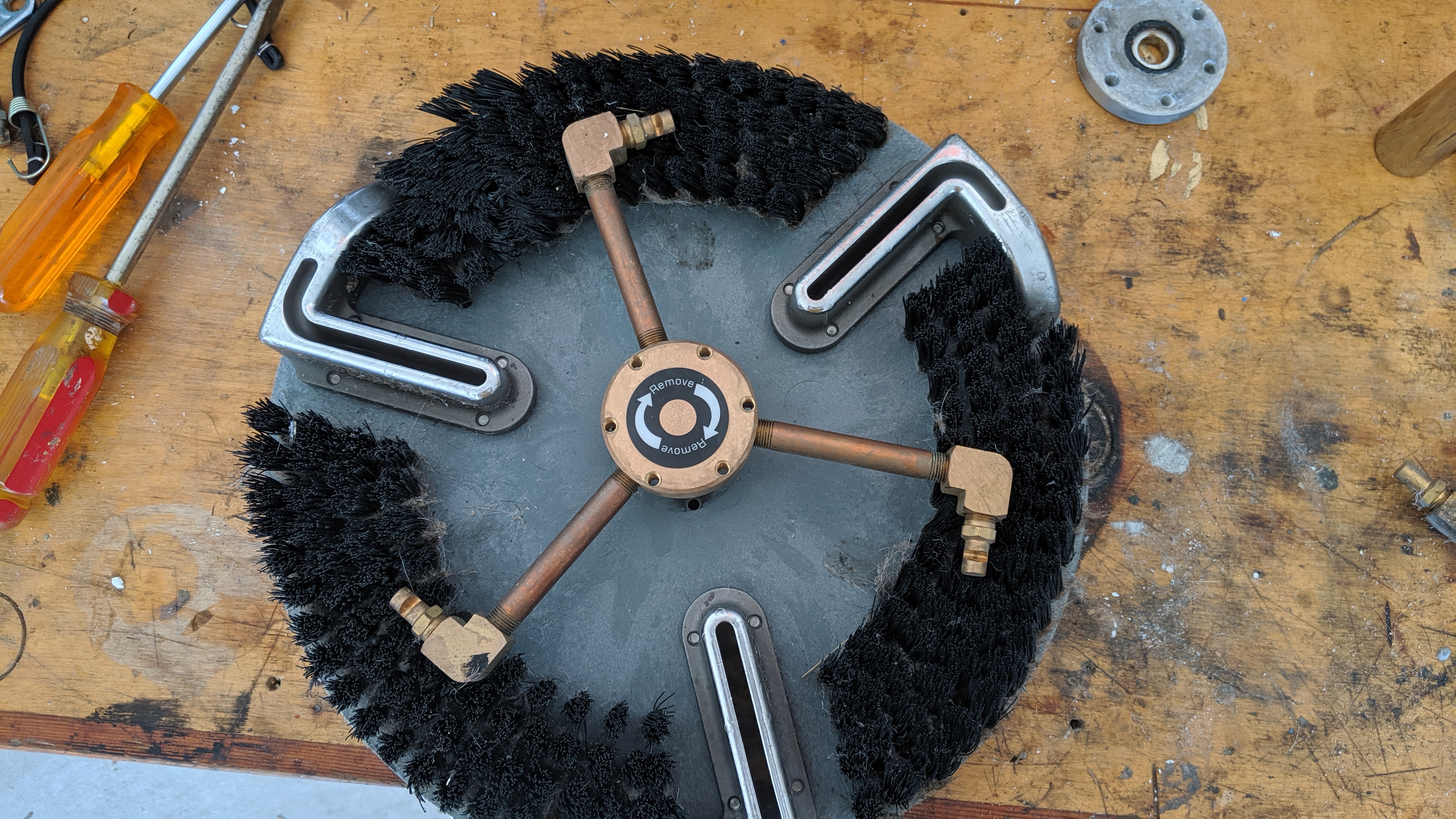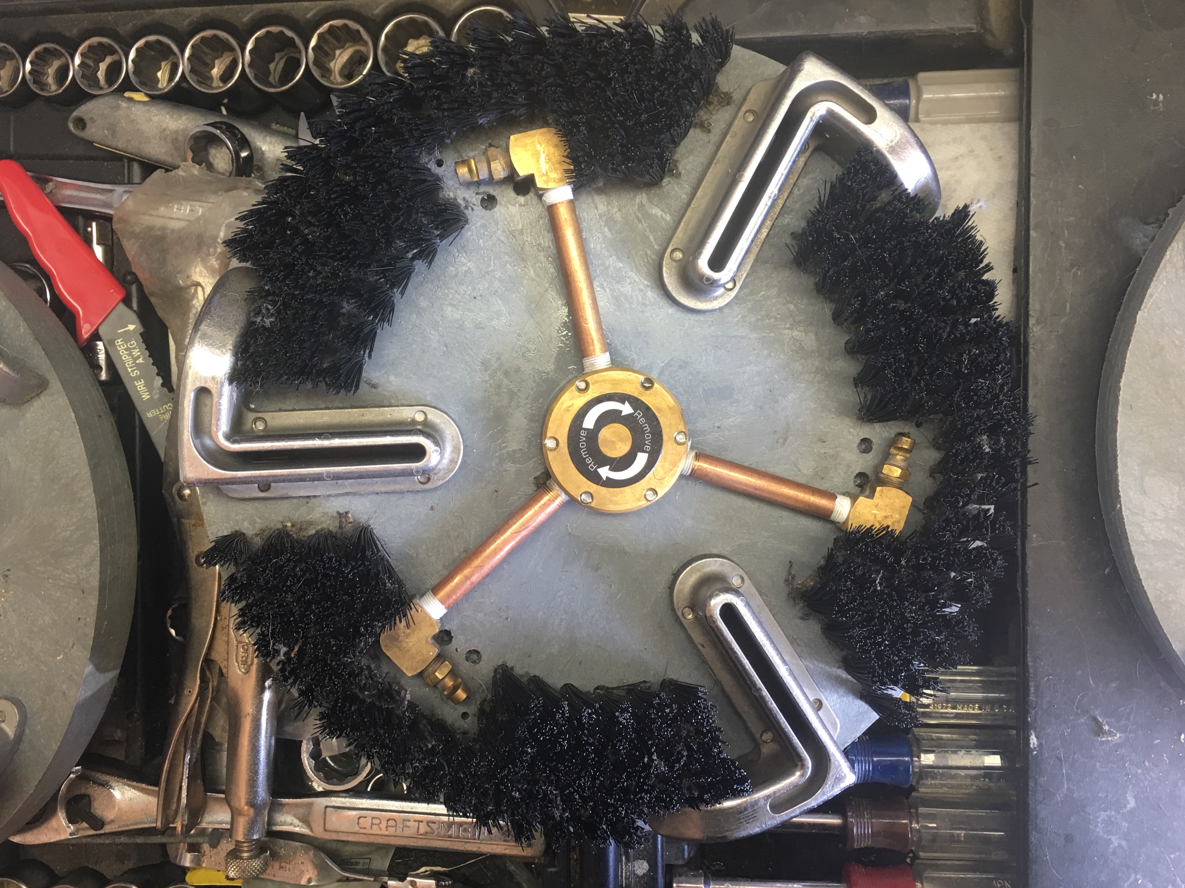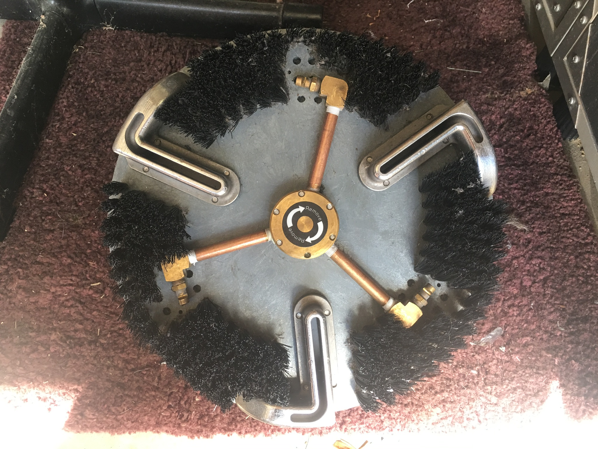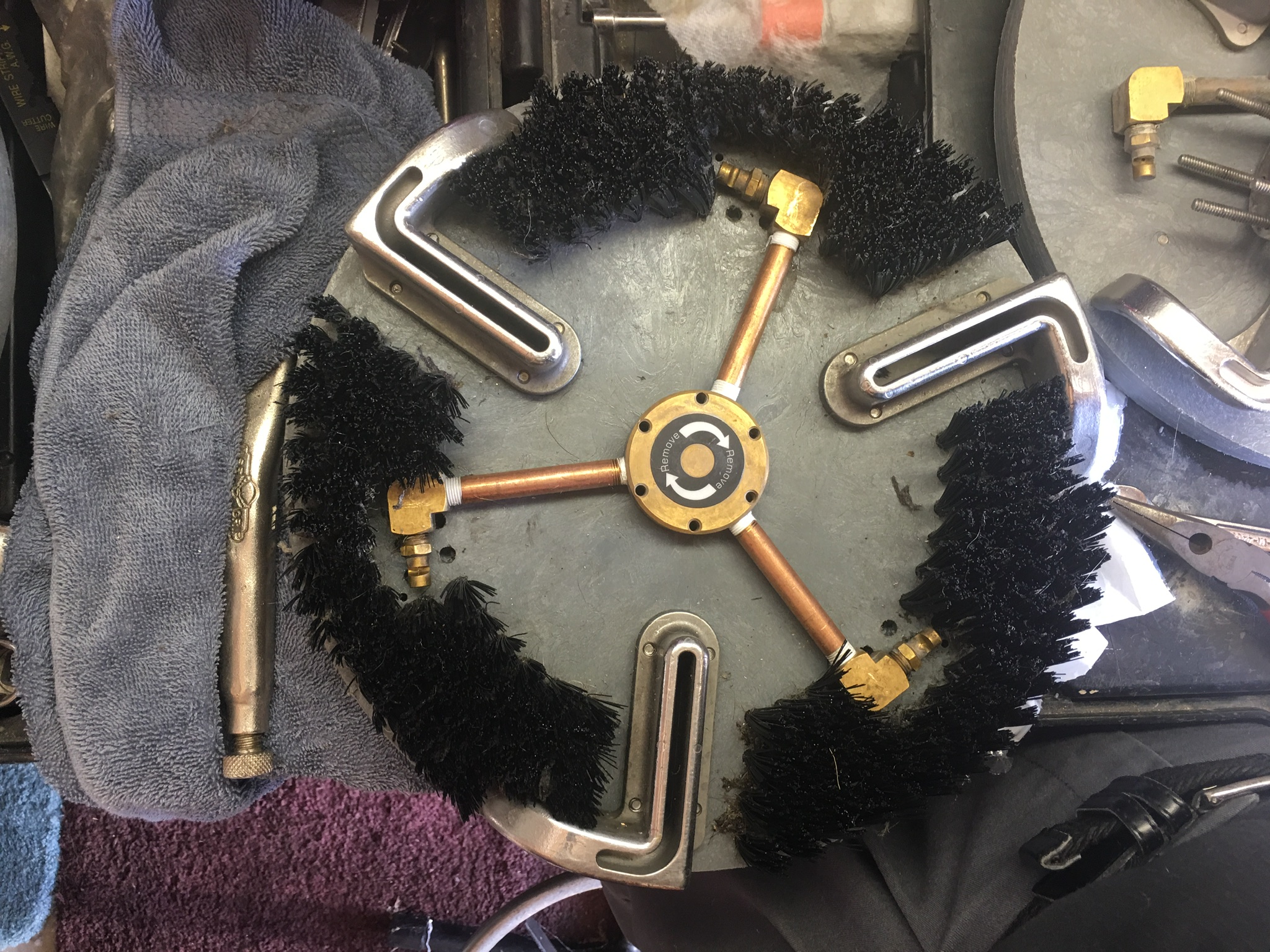 I left one row of bristles on the outside. The quad head with the jets centered between vacuum ports will give a slight overspray so I thought leaving some tufts at the outer ring would eliminate that. As you can see from the pictures, the other quad head cannot overspray due to the jets positioning inside the right angle vac slot. I tried to do the same with the tri-head but the jets would not be positioned correctly to work.
