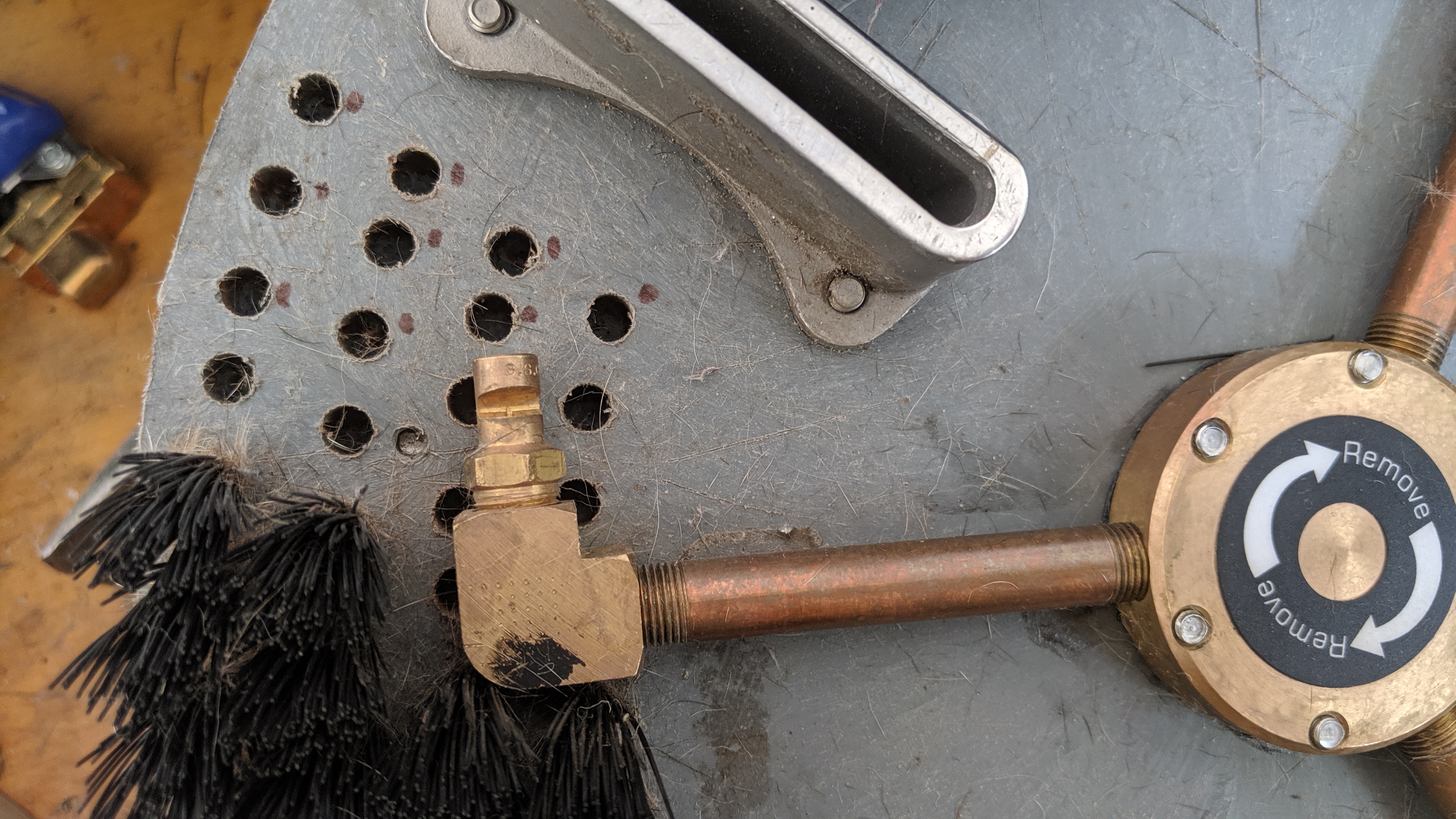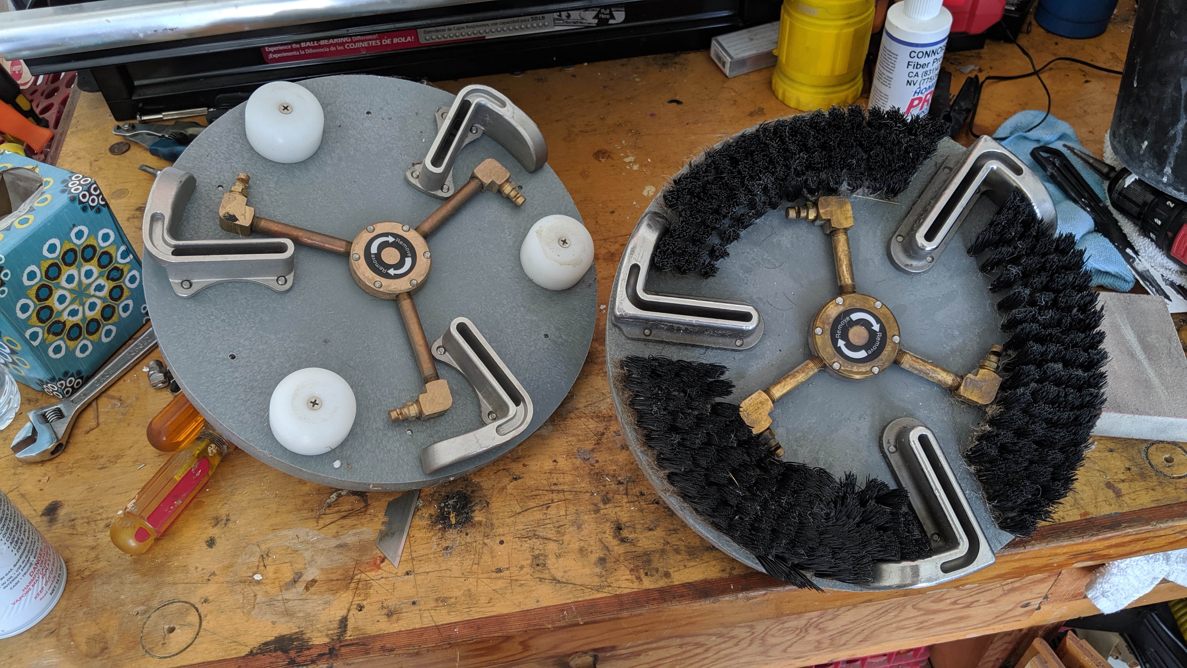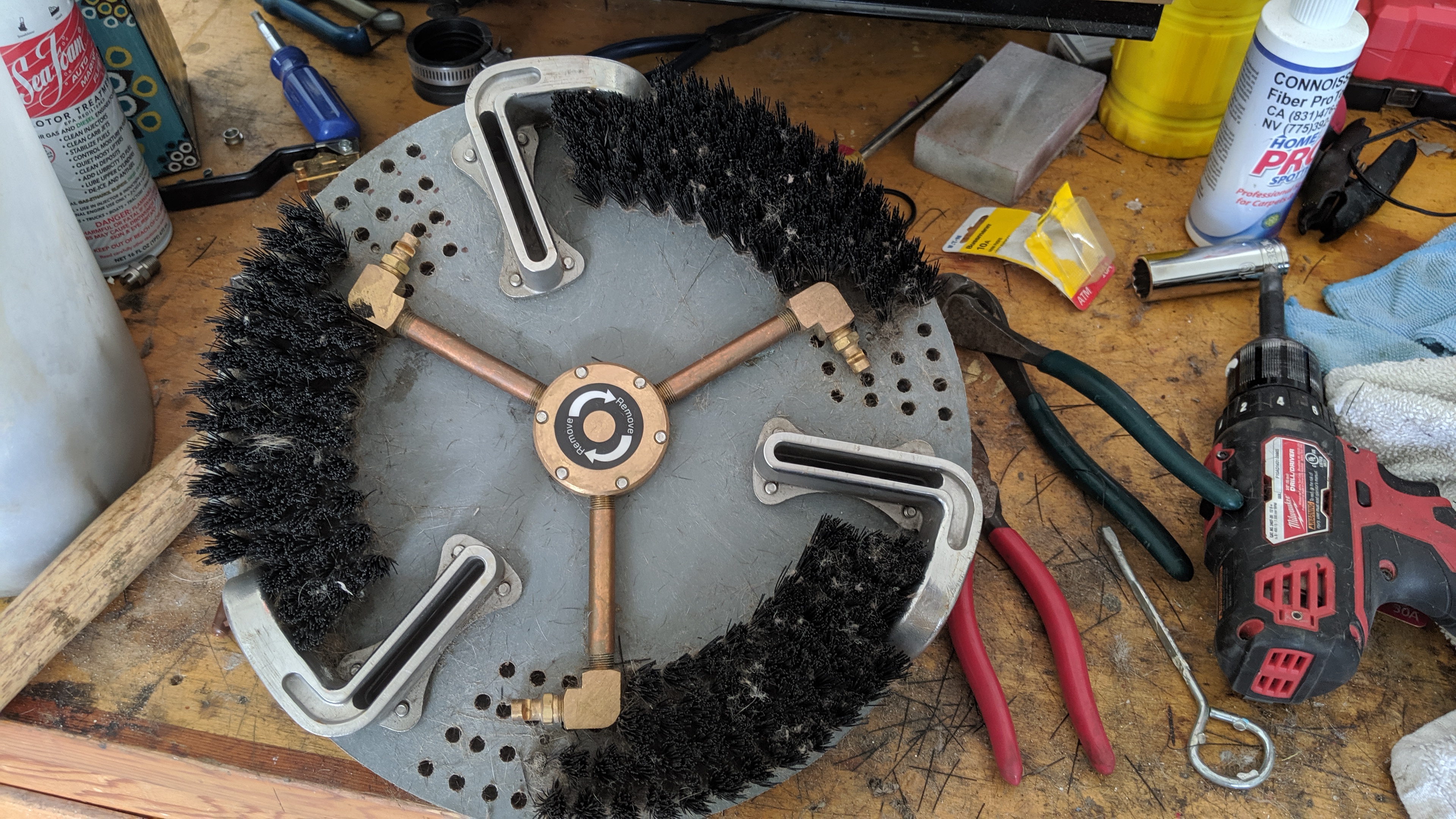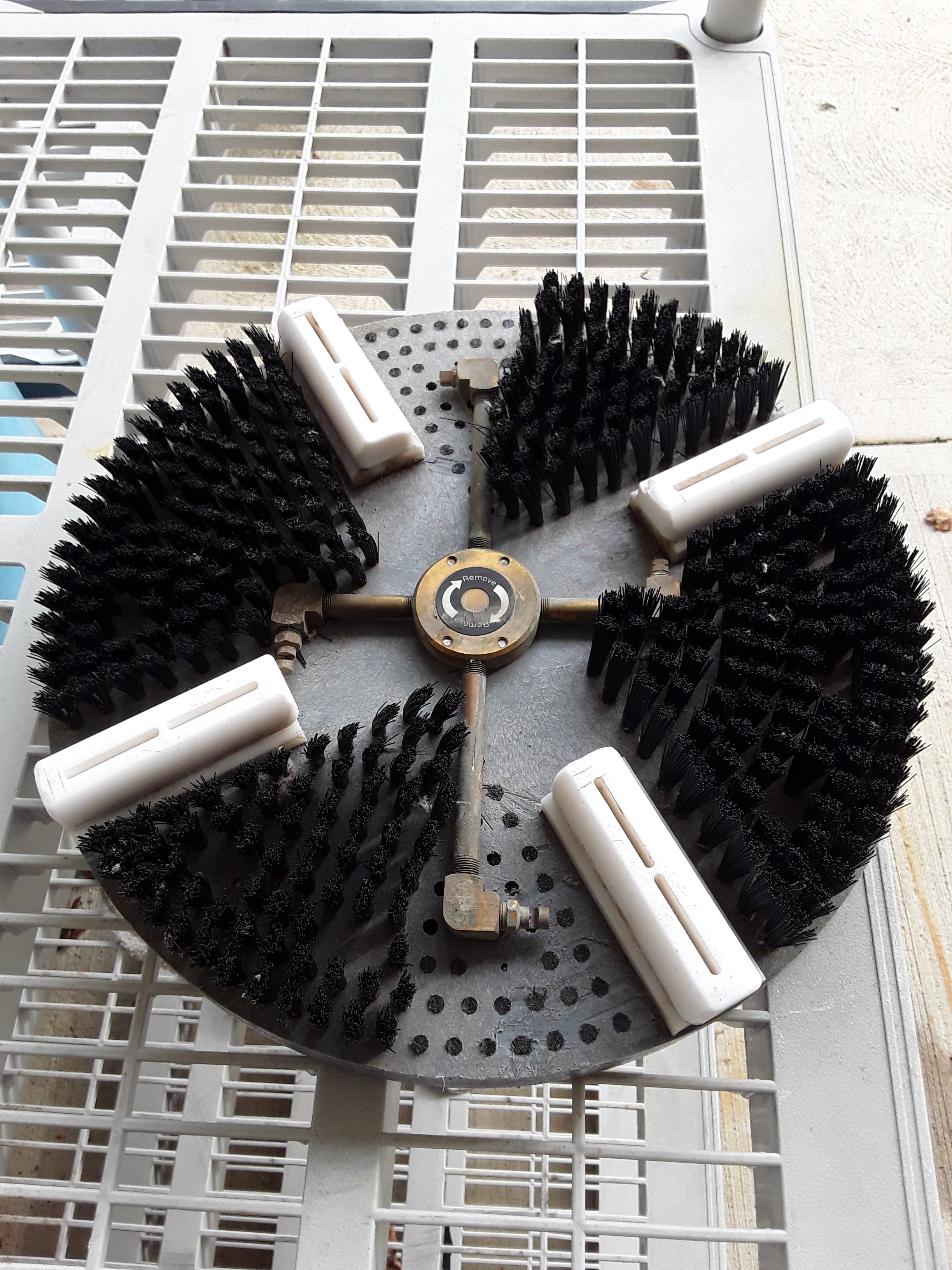 I left one row of bristles on the outside. The quad head with the jets centered between vacuum ports will give a slight overspray so I thought leaving some tufts at the outer ring would eliminate that. As you can see from the pictures, the other quad head cannot overspray due to the jets positioning inside the right angle vac slot. I tried to do the same with the tri-head but the jets would not be positioned correctly to work.