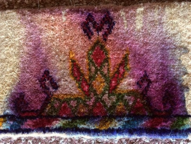 A float is a fiber that skips one or more cross fibers. In the fabric above, where you see color is where there is no float. In the gold areas the gold fiber skips three or four cross threads and hides the color of the cross fiber. Floating fibers are more prone to distortion and breakage, so cleaning should be done in the direction of the floating fiber. (left to right in this photo)